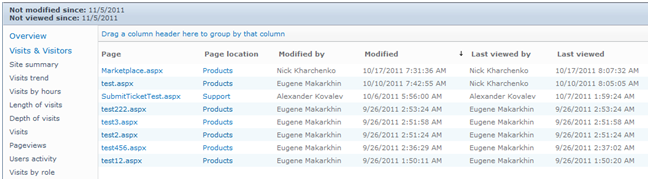 The “Unused pages” report shows the list of all pages which haven’t been visited since a specified date. The report also indicate the author of the page and the last user to visit the page: