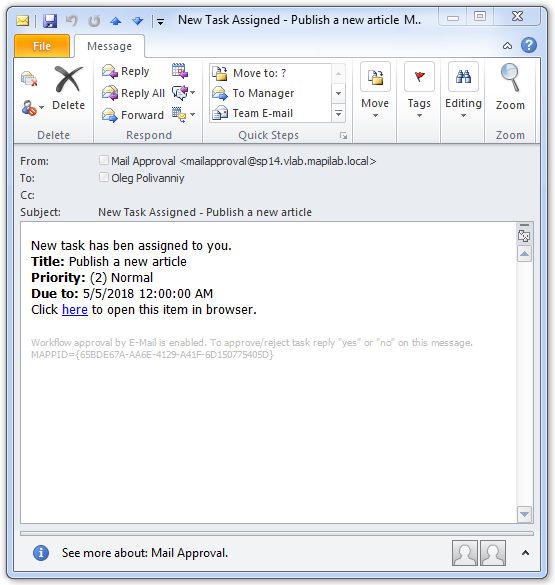 - The message text itself can be made in any suitable manner according to your goals, the style of your correspondence, or personal preferences. From the technical point of view, the most important is the last string of the message, which the second workflow (which parses responses to notifications) will use to find the item in the task list and mark it as approved or rejected.
